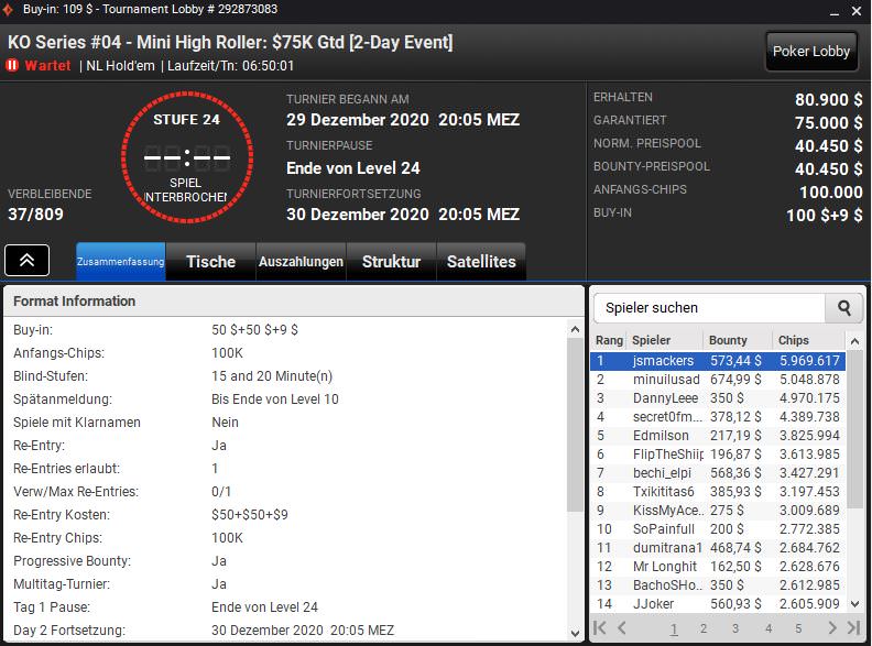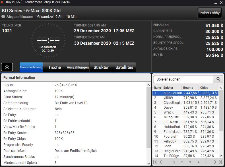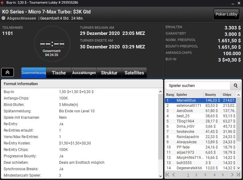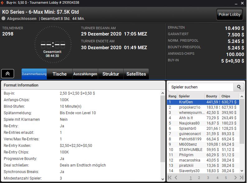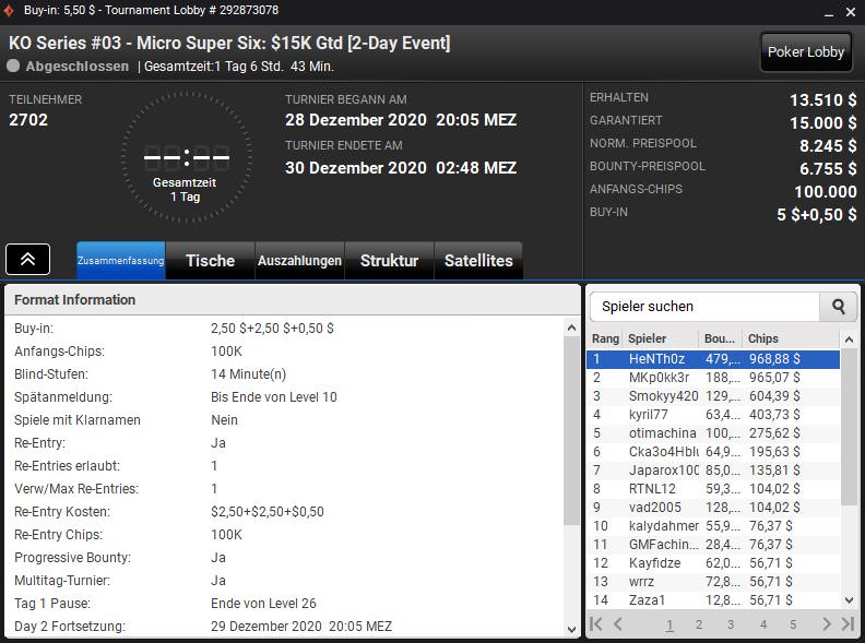 Das $55 NLHE Mini Super Six PKO gewann Lupittamancueba ($5.013,45/$3.552,10), das $5,50 NLHE Micro Super Six PKO HeNTh0z ($968,88/$479,65).