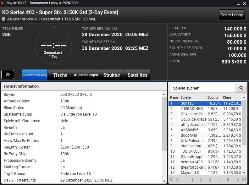 Das höchste Preisgeld schnappte sich SunTzu mit dem Sieg beim $530 NLHE Super Six PKO. Insgesamt wurden hier $150.000 ausgespielt, SunTzu bekam davon $11.925,07 plus $18.234,40 an Bounties ausgezahlt.
