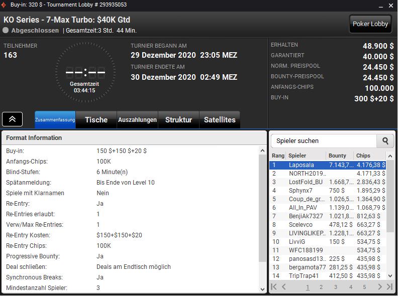 Bei den Side Events war Laposala der größte Gewinner, sein Sieg beim $320 NLHE 7-Max PKO brachte $4.176,38 plus $7.143,77 an Bounties.