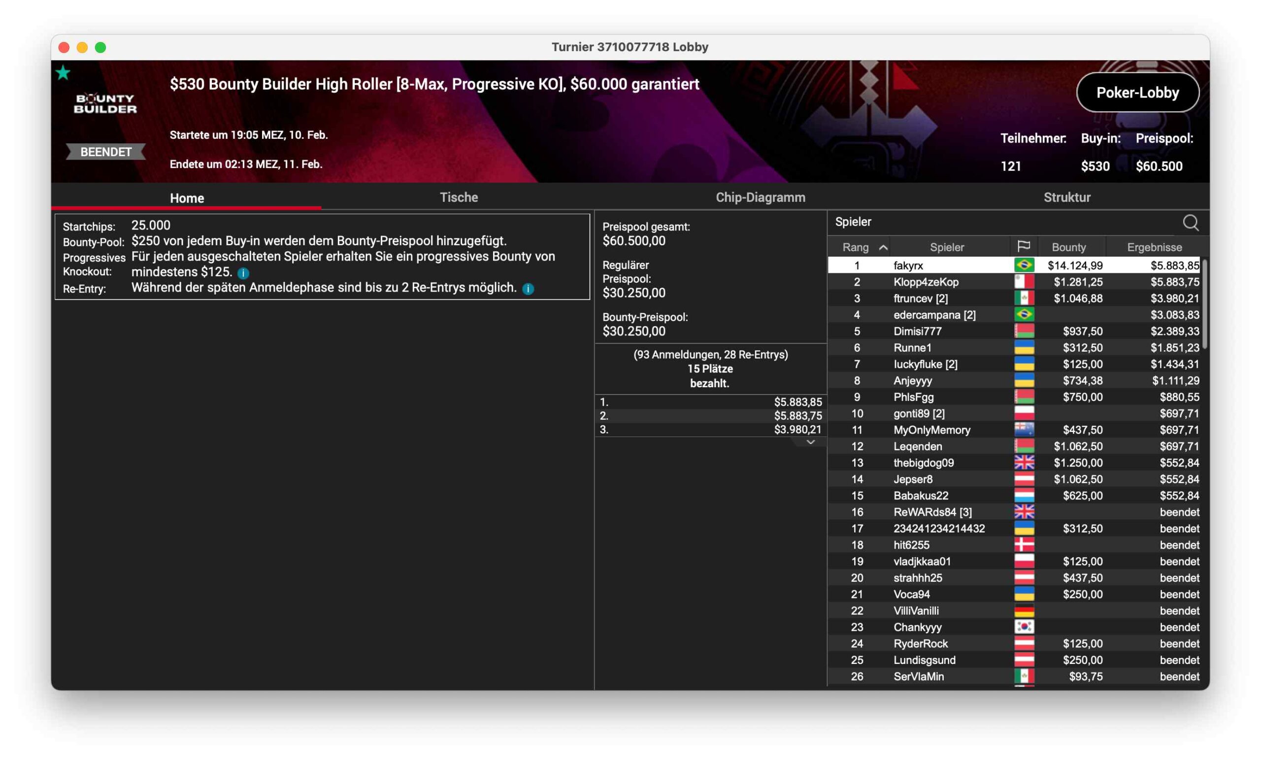 Das $530 Bounty Builder hatte am Samstag 121 Entries und einen $60.500 Preispool. Der Sieg ging nach Brasilien an „fakyrx“ für $14.124 + $5.883.