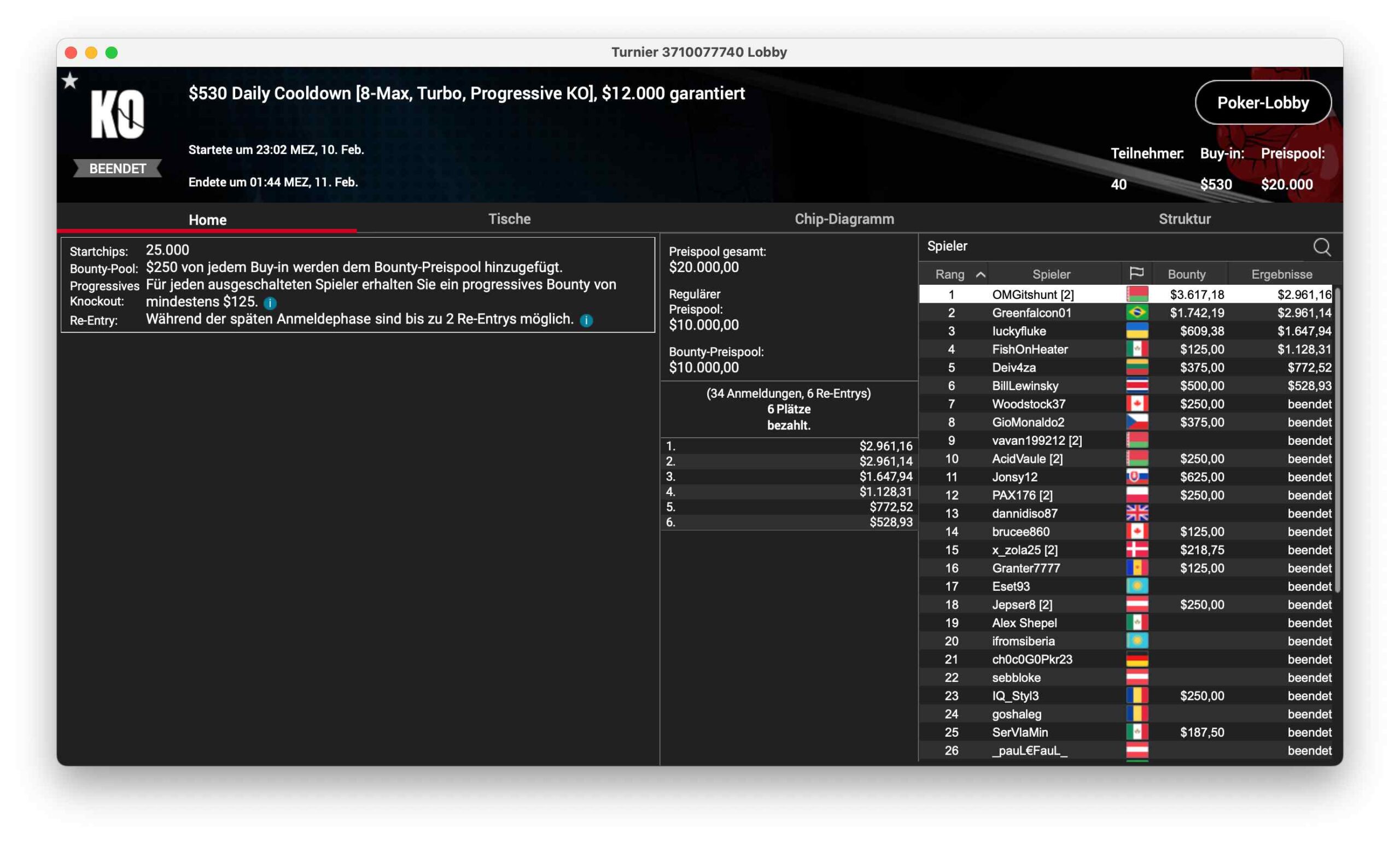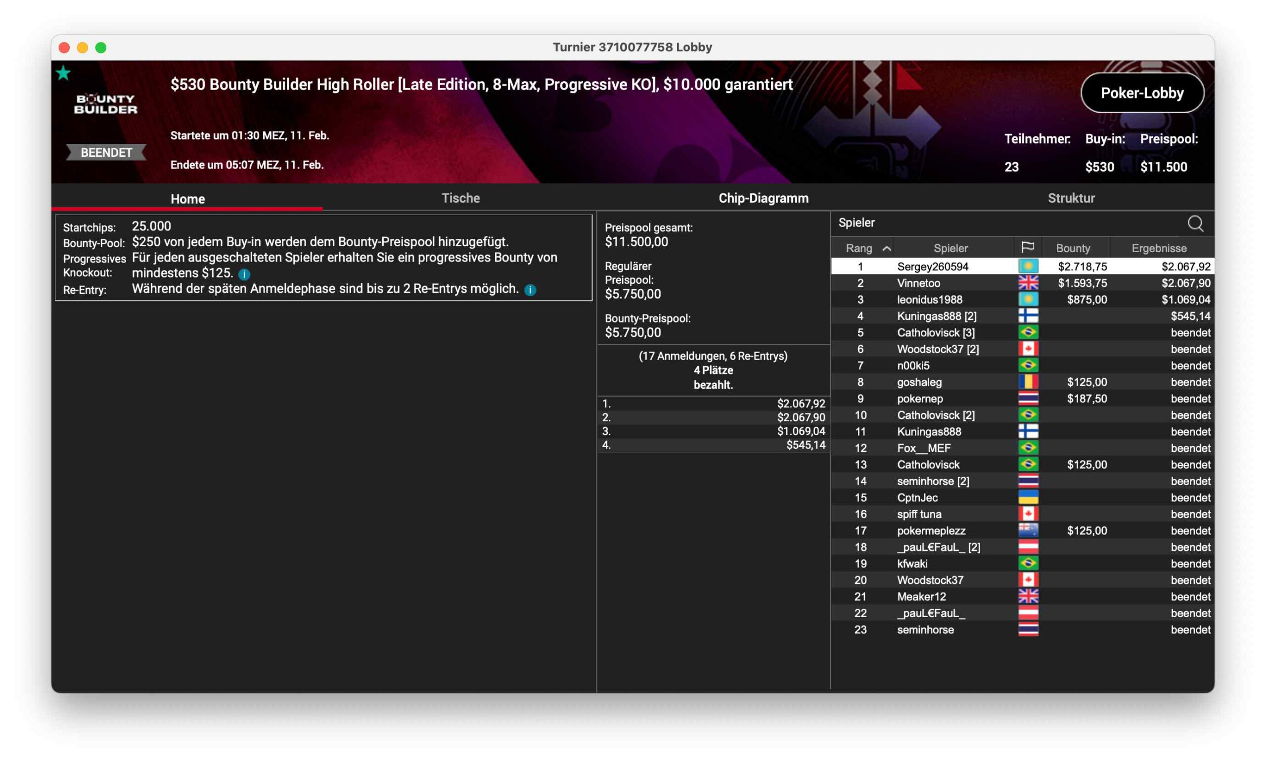 Die Spätausgabe des $530 Bounty Builder hatte 23 Entries und $11.500 Preispool. „Sergey260594“ gewann und sackte $2.718 + $2.067 ein.