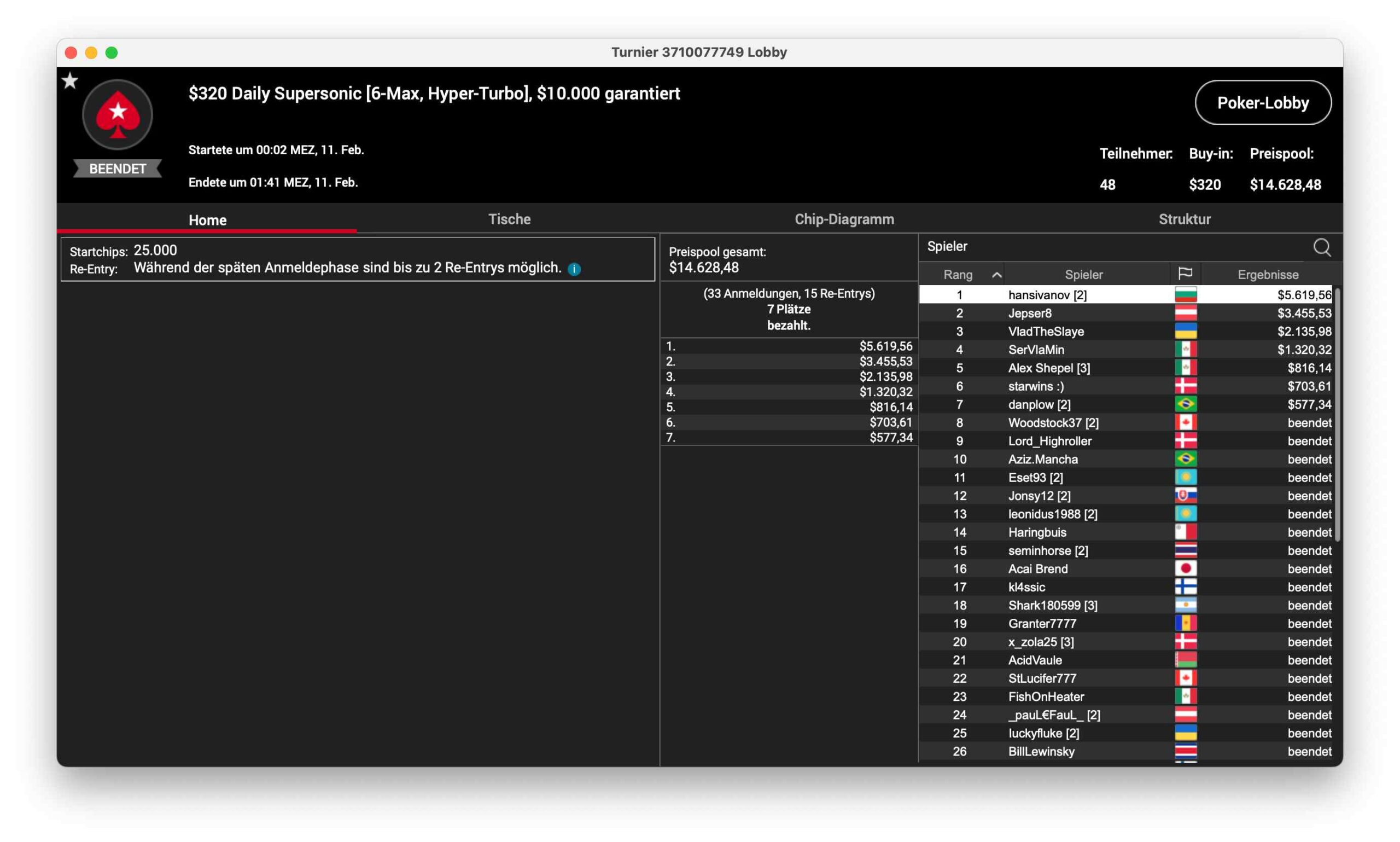 Für „Jepser8“ aus Österreich gab es einen Platz 2 im $320 Daily Supersonic. Hier waren 48 Entries am Start, €14.628 kamen so im Preispool zusammen. Der Runner-Up brachte $3.455 ein. Der Sieg ging an „hansivanov“ für $5.619."Jepser8" auf Platz 2 im PokerStars Daily Supersonic! | Hochgepokert