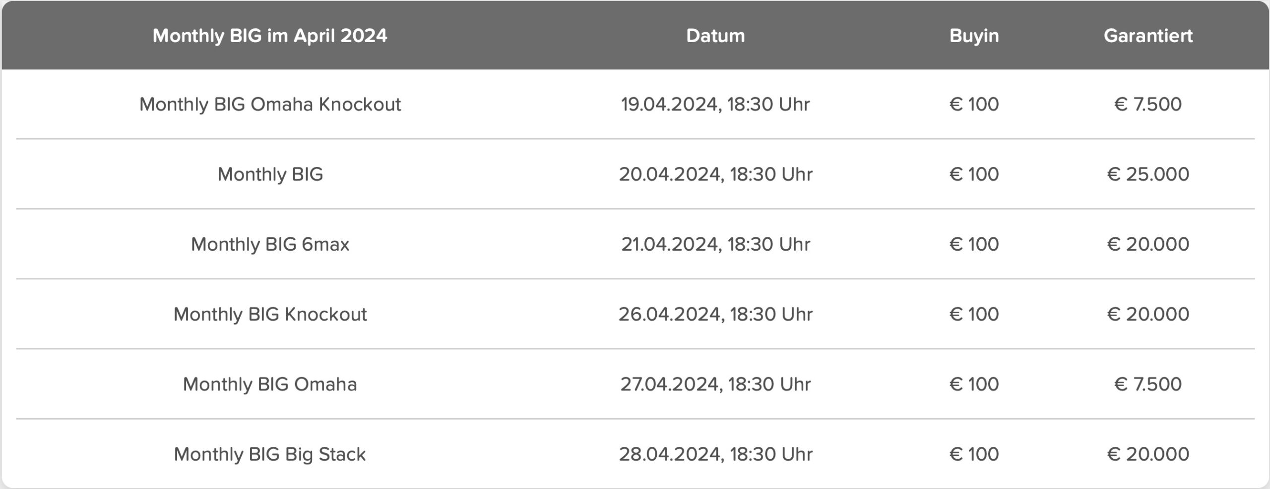 Zu den Highlights der wiederkehrenden Turnierserie gehören in jedem Fall das Monthly BIG am Samstag (20. April), in dem um midestens garantierte €25.000 gepokert wird.