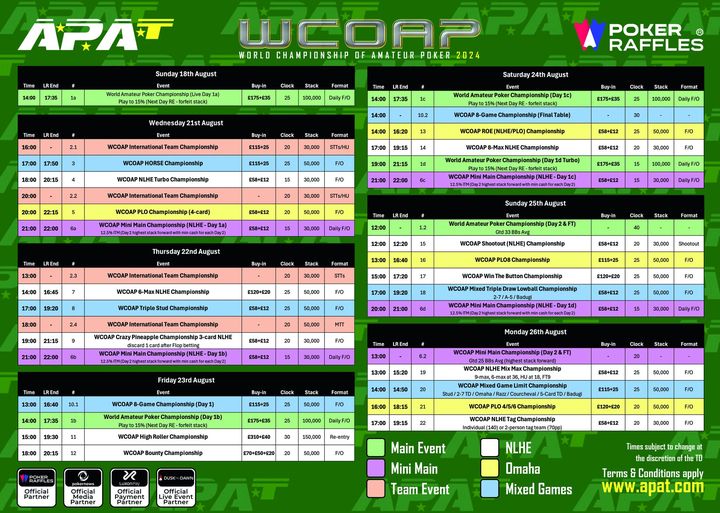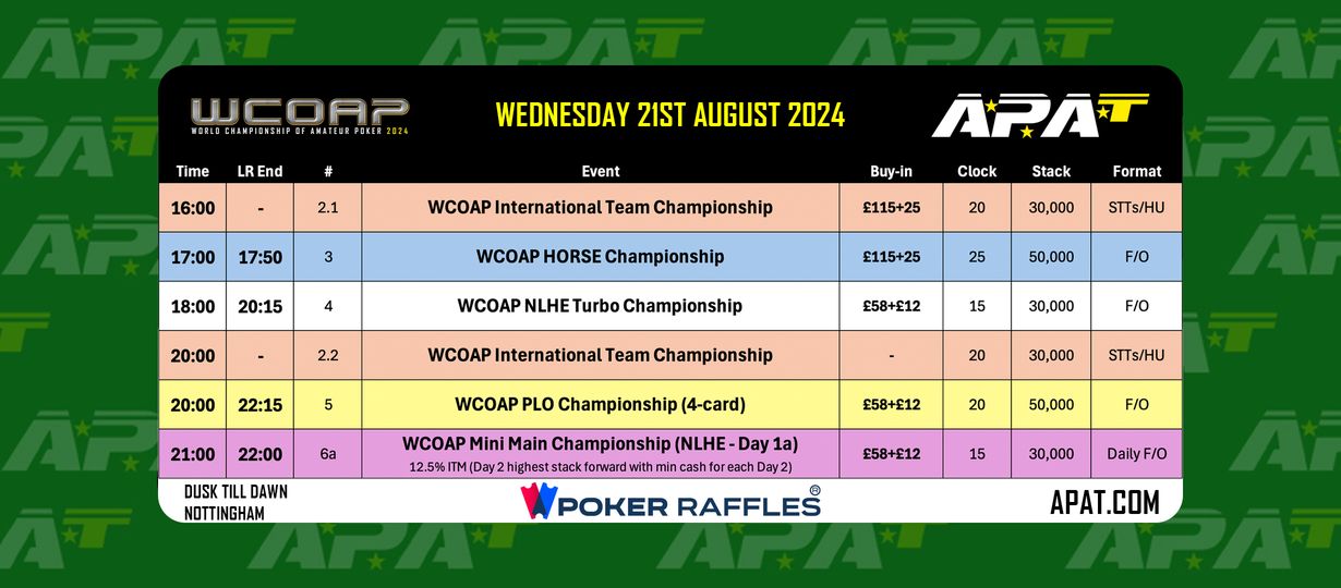 Am Mittwoch gibt es ab 15:45 Uhr live aus dem Dusk Till Dawn Pokerroom in Nottingham den Livestream vom Round 2 (Sit & Go) der APAT / WCOAP 2024. Das Team Germany wurde in Kooperation mit dem Grand Casino Aš aufgestellte. Ab 15:45 Uhr Livestream vom Team Germany bei der WCOAP 2024! | Hochgepokert